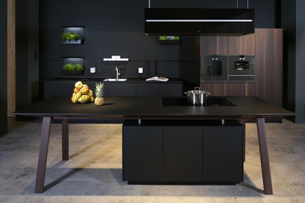 Induktionskochfeld macht's möglich: Kochfelder direkt in der Tischplatte. So kann eine Kochinsel gleichzeitig ein Esstisch sein. Das ist nicht nur gewitzt, sondern auch platzsparend. Das Tolle: An diesem Tisch kann man sitzen und kochen, denn an den Seiten herrscht Beinfreiheit, nur unter dem Kochfeld befindet sich ein vom Design her passender bodentiefer Unterbauschrank.