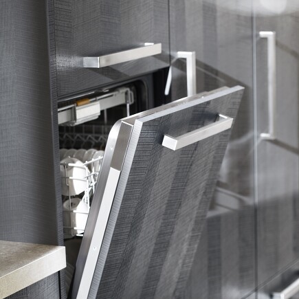 Die vollintegrierte Spülmaschine verschwindet vollständig hinter der Küchenfront, sodass ein Fremder in Ihrer Küche gar nicht erkennen kann, an welcher Stelle sich das Gerät befindet. Dazu verkleiden wir den Geschirrspüler komplett mit den Küchenfronten, die Sie sich für Ihre Küche ausgesucht haben.