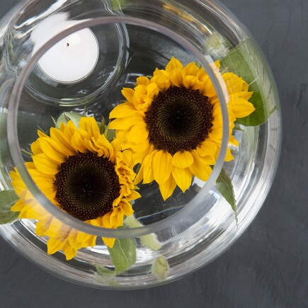 Sonnenblumen sind ein echter Hingucker. Haben Sie auch welche auf dem Balkon oder im Garten? Falls Wind oder Gewicht ihren langen Stiel abknicken sollte, retten Sie die Blüten doch in einem Goldfischglas oder einer schönen Schale. Füllen Sie Glas oder Schale dazu einfach zur Hälfte mit Wasser, legen Sie einige Kieselsteine hinein und lassen die Sonnenblumen-Blüten darüber treiben. Schwimmkerzen dazu, fertig. Das sieht wunderschön aus und ist auch dann eine Lösung, wenn für mitgebrachte Sonnenblumen keine ausreichend große Vase vorhanden ist!