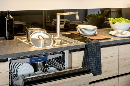 Dass man den Backofen auf Sichthöhe einbauen kann, das hat sich ja mittlerweile in den Köpfen festgesetzt. Aber denken Sie mal weiter: Was ist mit dem Geschirrspüler? Hier muss man sich doch viel mehr und viel öfter bücken, um ein- und auszuräumen. Auch hier ergibt ein halbhoher Einbau Sinn.
