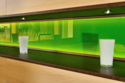 Eine schöne indirekte Beleuchtung entsteht in Küchenschränken mit Glastüren, die Sie durch den Einsatz von LED-Stripes illuminieren können. Diese schmalen Lichtbänder verbrauchen wenig Strom. Noch günstiger in der Anschaffung sind LED-Lichtschläuche, gut für den Bereich der Sockelleisten geeignet. Wenn Sie der Frühaufsteher sind, der sich oft morgens im Dunkeln seinen Kaffee macht, braucht es auch ein sanftes Licht für die Nische mit der Kaffeemaschine.