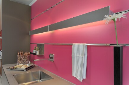 Auch mit weniger als zehn Quadratmetern kann eine Küche mit viel Stauraum ausgestattet sein und trotzdem weiträumig wirken. Hochglanzfronten sorgen z.B. mit ihrem Spiegeleffekt für optische Raumvergrößerung. Die Küchenunterschrank-Beleuchtung unterstützt diesen Effekt mit ihrer Reflexion im Küchenschrank über Eck. Der Arbeitsbereich erfährt durch das blendfreie indirekte Licht noch eine extra Ausdehnung. Die Rückwandverkleidung ist in diesem Beispiel aus leicht abwaschbarem glänzend-bedrucktem Melamin: eine geschlossene Fläche, die kleinen Küchen insgesamt gut tut.