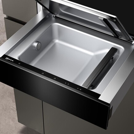 Vakuumiergeräte kennt jeder, aber was soll das als Schublade, und wo ist der Vorteil? Zum einen werden die Schubladen eingebaut, man muss also nicht noch ein weiteres Elektrogerät irgendwo verstauen. Zum anderen entsteht das Vakuum in der gesamten Schublade und das bedeutet, dass man auch Suppen, Soßen oder etwa Mariniertes vakuumieren kann.